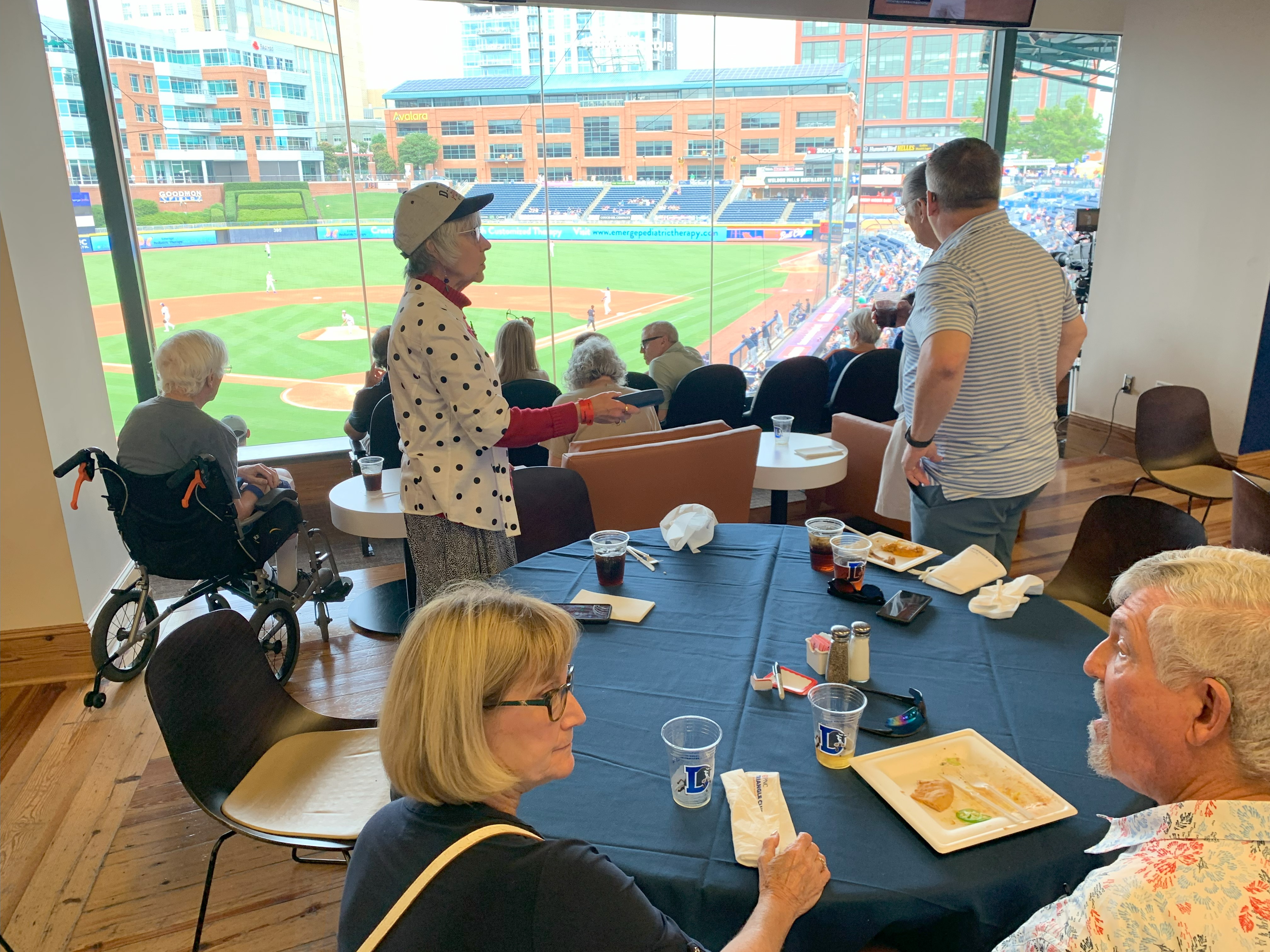 On a hot Sunday afternoon at the end of June, about 20 of us gathered at the Durham Bulls Athletic Park's air-conditioned PNC Triangle Club to watch the home team battle the Lehigh Valley Iron Pigs. While the boys of summer gave their all on the diamond, we bellied up to the delicious buffet and enjoyed cool libations. Clouds appeared to threaten the fun during the fifth inning, but they passed by overhead with nary a drop. The Bulls scored first, and brought home two more in the fourth, but the Iron Pigs responded with alacrity, capping off their effort with two final runs in the last inning to seal the win for the visitors, 6-3.